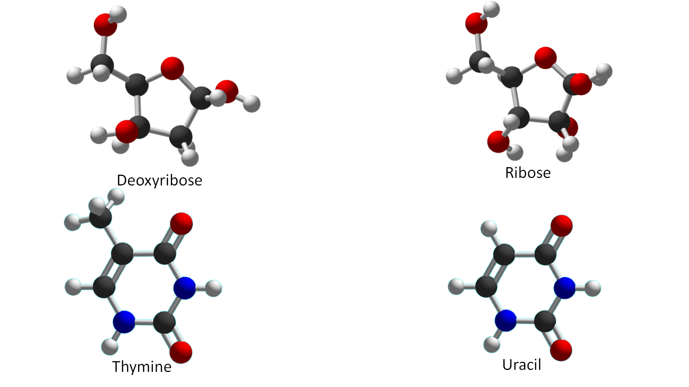 DNA is similar to another nucleic acid, ribonucleic acid (RNA), which is also a linear polymer of nucleotides. There are though two things that distinguish DNA from RNA (Figure 1). Firstly, the DNA contains deoxyribose as its pentose sugar, so named, because it has one fewer oxygen atom than the ribose sugar found in RNA. Secondly, the DNA contains thymine as one of its bases, whereas RNA contains uracil. These two bases have the same role in these different molecules, both having complementarity with the adenine base.